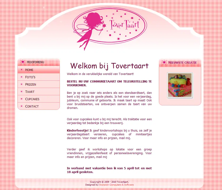 De doelgroep heeft een bepaald verwachtings-patroon over de look-and-feel van een website die gaat over taarten. Daarom hebben we deze, voornamelijk, roze website ontwikkeld. De opdracht was verder om het logo een nadrukkelijke plaats te geven. Subtiele flash-elementen maken de website tot een magisch geheel.